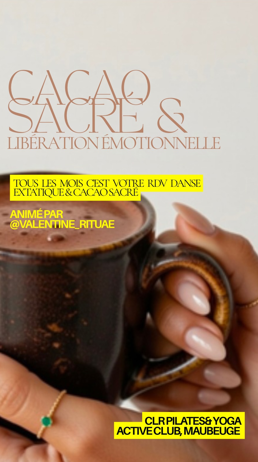 Dimanche 22 Mars 2026 à l’Active club de Maubeuge (univers CLR yoga&pilates) venez découvrir la puissance de la libération émotionnelle avec un atelier cacao sacré et danse extatique.